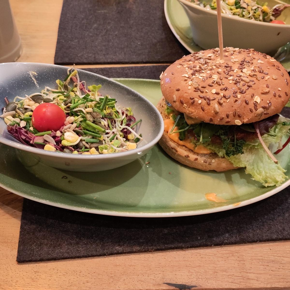 This super delicious combo, available until 5 pm, contains a vegan #burger 🍔 of your choice (I chose the burger called "Weltenbummler" with a falafel patty, avocado spread 🥑, jalapeños 🌶️ and lettuce 🥬 with herbs), a side like a small salad or fries (I picked a #redcabbage #salad called "Winterkrautsalat" (which might be limited edition) with an aromatic dressing, topped with a cocktail tomato, crunchy sweet corn, sprouts and seeds), a cold beverage and a hot beverage of your choice (not pictured here, for hot beverages like cappuchino, latte macchiato etc. they offer oat mylk without a surcharge). The burger is very delicious, with a crispy patty, aromatic avocado spread, pleasantly hot jalapeños and crispy lettuce with herbs. The red cabbage salad is crunchy and pairs well with the aromatic dressing which isn't as sour as most other vinegar-based cabbage salad dressings. Price 16,80 € for the whole menu.