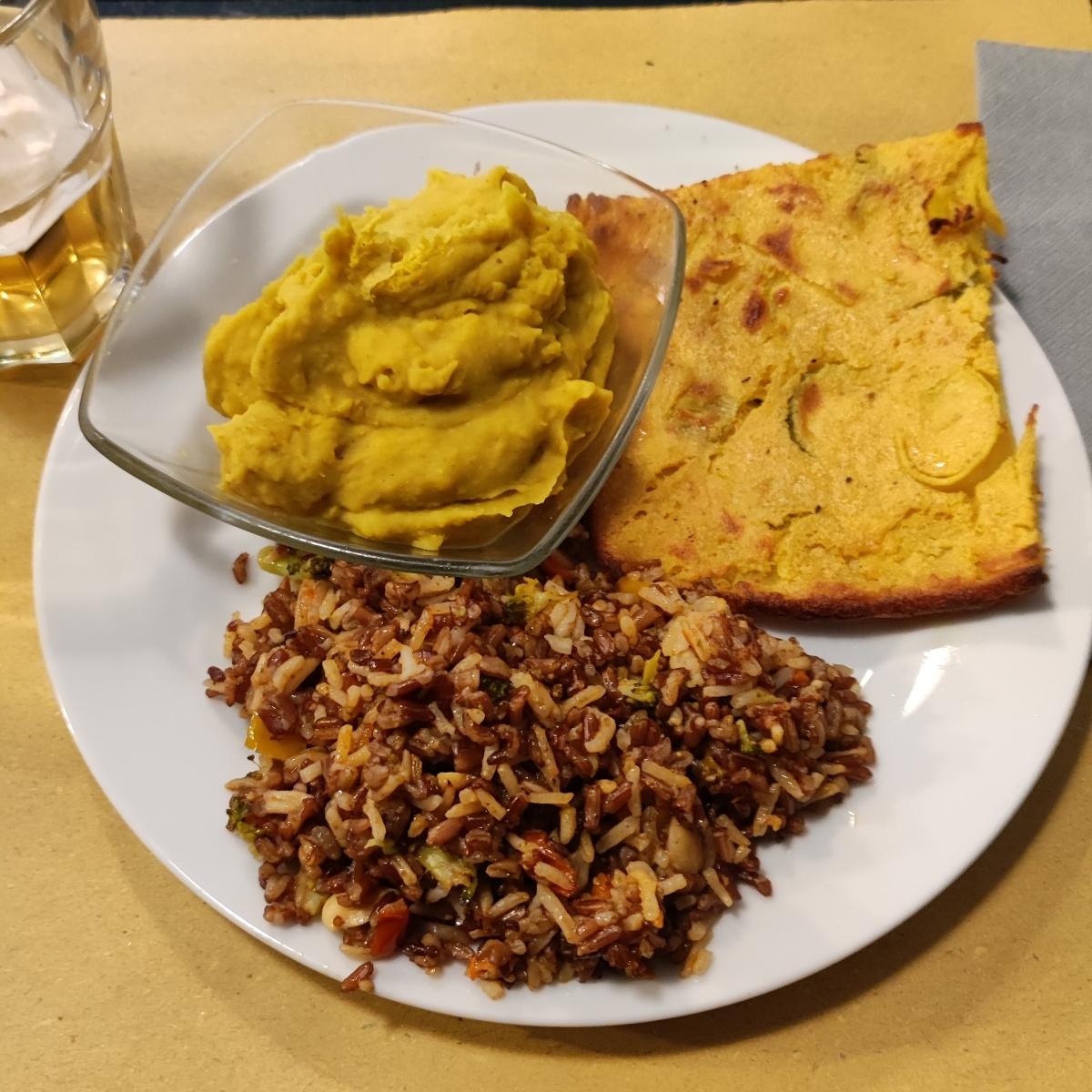 Mi sono fermata da Mezzaluna per un pranzo molto molto tardi (alle 15.00 circa), ed ho ordinato 3 assaggi misti dal bancone della gastronomia. Trovo che sia davvero una gran cosa trovare un posto dove poter andare a mangiare a qualsiasi ora, è molto comodo soprattutto se sei un turista. Il cibo non è male ma non totalmente di mio gusto. Il Dahl di lenticchie era davvero molto buono ma aveva più una consistenza tipo hummus rispetto a quella di un vero Dahl dove le lenticchie rimangono un po' più intere. Il mix di riso rosso e basmati con le verdure e la farinata di ceci con verdure erano abbastanza buoni ma mancava decisamente del sale e questo ha rovinato un po' i piatti. Come accompagnamento avevo ordinato dei grissini al sesamo, buonissimi ne avrei mangiati a decine.