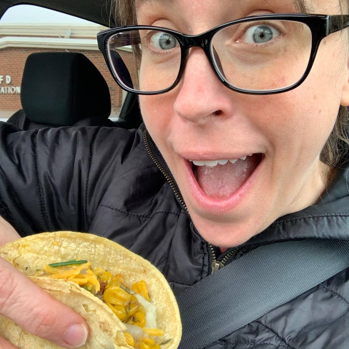 They had me at #comfortfood 😊 #mashedpotato + #seitan #veganchicken + green onions + #vegancheese + corn all in a tortilla. Unique and totally delicious! 🥳🌮 #uplandspeak #tacos #vegan #veganisnotscary
