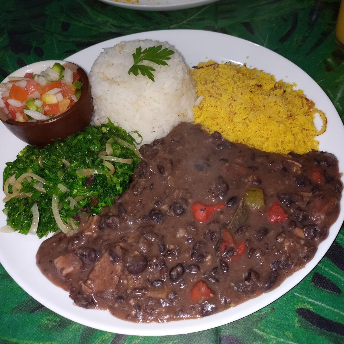 Um prato delicioso! Foram servidos: feijão com legumes e carne de soja, farofa acebolada, couve verdinha acebolada, arroz branco e vinagrete, além de laranja de sobremesa. Foi um jantar muito prazeroso na pousada!!!