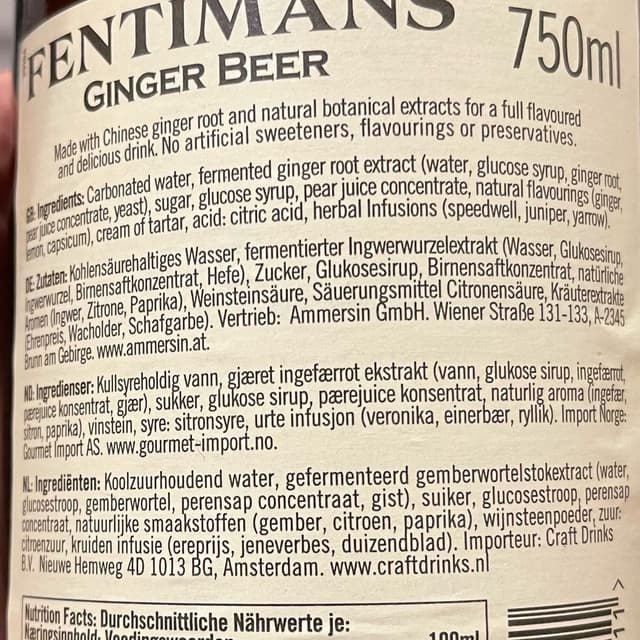 Very nice ginger beer. In the “is it vegan” app it says it is probably vegan. Tastes very good of ginger and is also nice and spicy. It’s prickly and sweet.