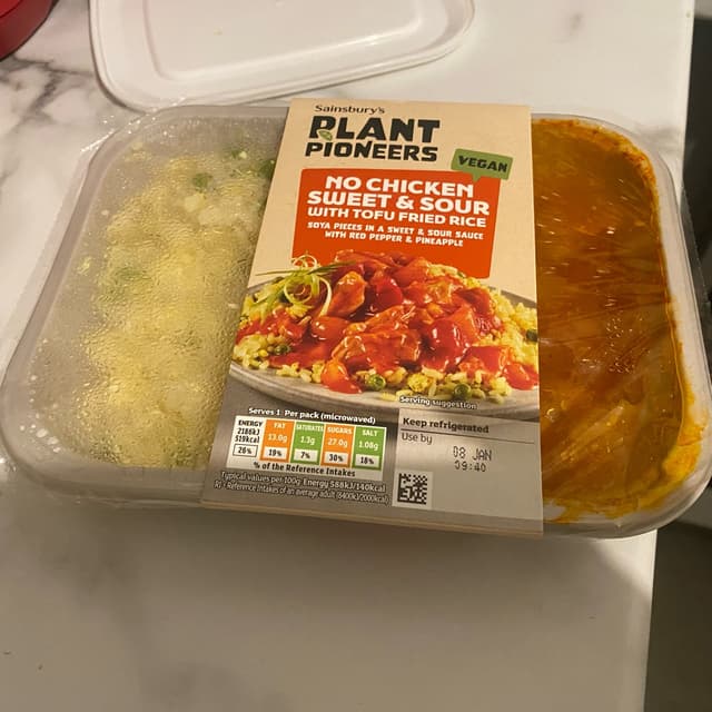 Introducing our vegetarian ready meal, No Chicken Sweet & Sour with Tofu Fried Rice. This dish is made with high-quality ingredients and is packed with flavor and nutrition. The savory sweet and sour sauce perfectly complements the crispy tofu fried rice, making it a delicious and satisfying meal option. It's a quick and easy solution for busy weeknights or for those who prefer plant-based options. With a generous portion size and an affordable price tag, this ready meal is a tasty and convenient choice for the whole family. Try it today and see for yourself why it's a popular choice among our customers.
