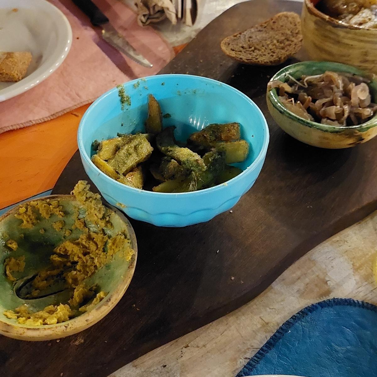 Picada vegaba con papas con provenzal, hummus, cebollas y berenjenas en escabeche y pan integral. Muy rica, sovre todo el hummus. Come uno, pican 2/3. Salió 2600 pesos.