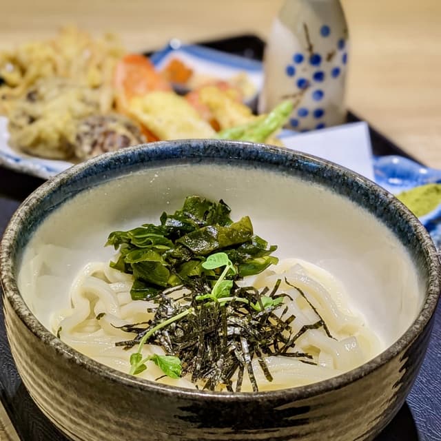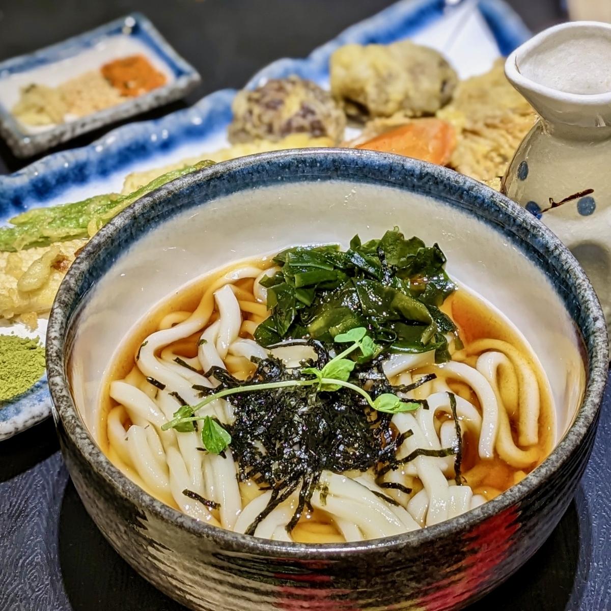 Chubby chilled udon noodles topped with shredded seaweed. Came with a bottle of savoury shoyu broth as well as additional condiments such as minced ginger, sesame seeds, shichimi pepper flakes, wakame kelp powder, and salted matcha powder (!!!) to adjust the taste of the udon and tempura to our liking. Served with the same battered tempura set as that in the Tendon Teishoku - konjac snowflake squid, shiitake mushrooms, enoki mushrooms, French beans, and carrot slices. The tempura was light and airy; not greasy. Slurp-worthy, customisable, and definitely my favourite main in this new menu! P.S. This is a new main as part of the Greendot One Raffles Place x Veg-An collab menu Wazen! (Allium-free, $12.90) #sgvegan