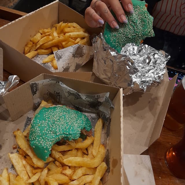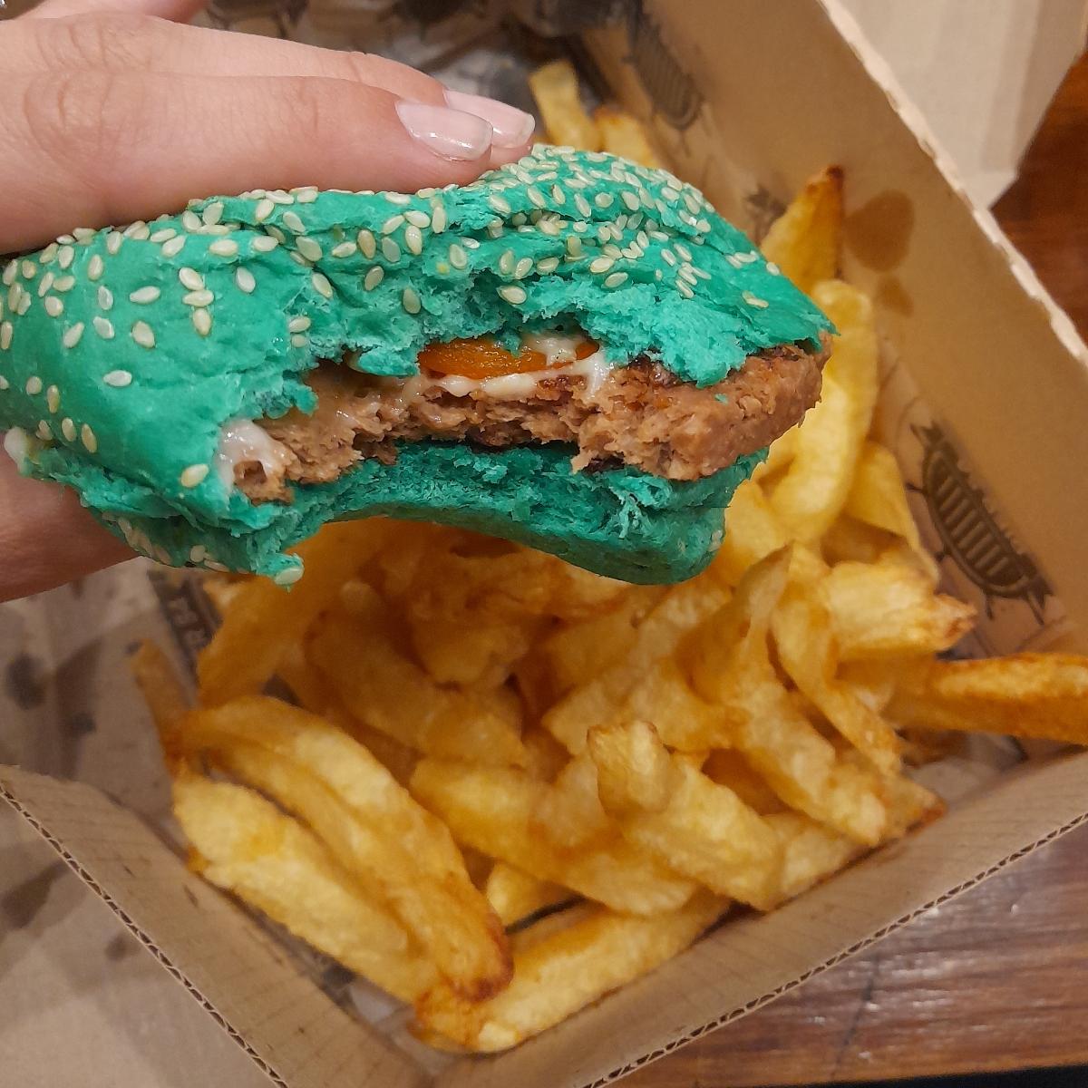 Trae medallon de Not, cebolla, morrones asados, muzzalmendra y creo que nada más. Muy muy rica y las papas 🤤🤤