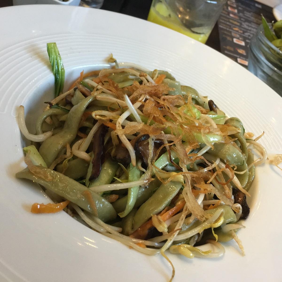 Tagliatelle fatte a mano al tè matcha saltate con verdure e funghi: tagliatelle corpose in bocca quindi soddisfacenti a mangiarsi già per questo motivo, unitamente al valore aggiunto della varietà di verdure e funghi saltati insieme.
