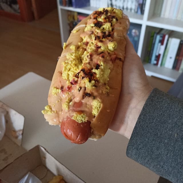 El tamaño del pancho está más que bien, además viene con papas. La salsa es re original, el huevofu una locura. Una combinación de sabores nuevos que son una fiesta juntos. Sí o sí tienen que probarlo.