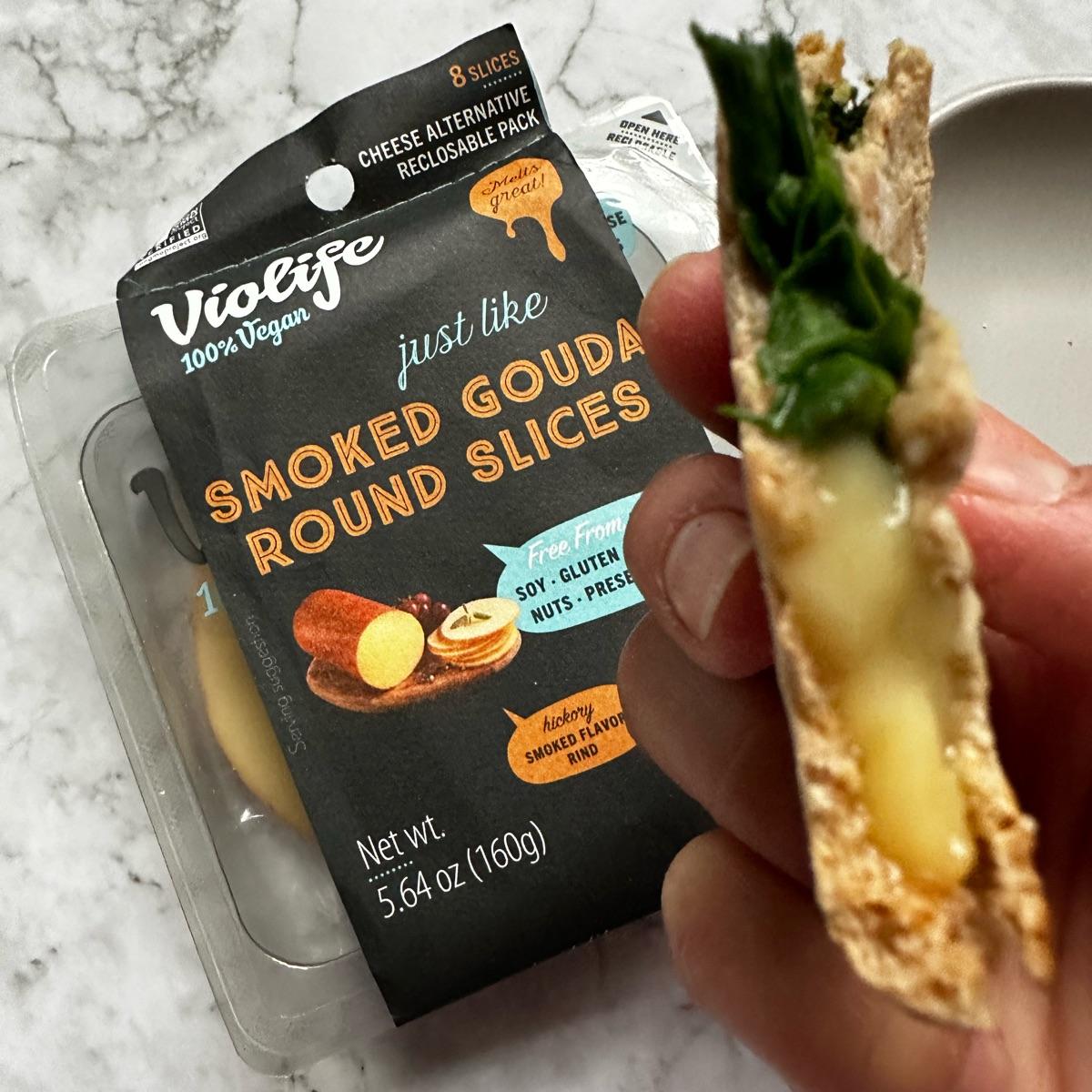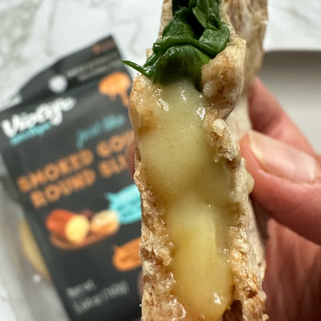 Another amazing 🤩 cheeze from Violife!! Smoked Gouda Round Slices are both good 👍🏼 cold or melted!! So tasty when melted! I kinda made a grill cheeze but in a pita 🫓 (Trader Joe’s) with spinach and stuck in the airfryer!! 😋😋🤤🤤