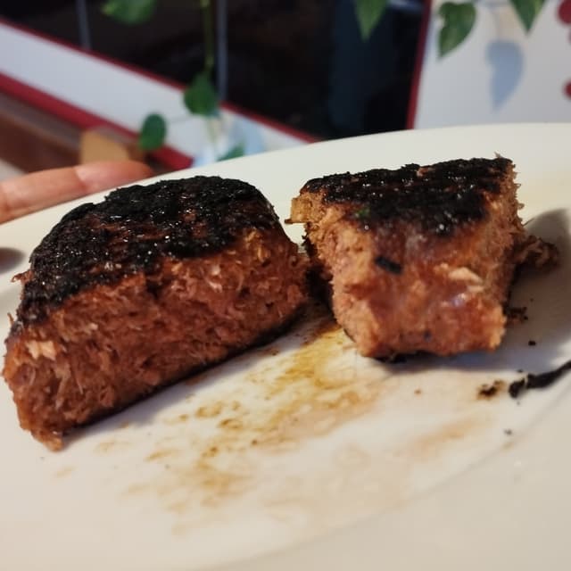 Die Inhaltsstoffe erinnern an Weizenbrot. Diesen Geruch nach Toastbrot verströmt es beim Braten. Selbst bei sehr niedrigen Brattemperaturen wird es schwarz und in der Pfanne bildet sich ein klebriger schwarzer Film. Schon das allein ist für mich nicht appetitlich. Schmeckt nach würzigem Brot.