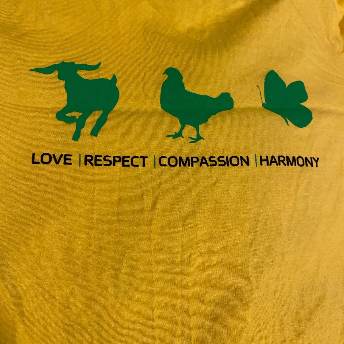 חולצה של חוות החופש בצבע צהוב מהמם עם ירוקמקדימה הסמל של החווה, ובצד האחורי הסלוגן המקסים באנגלית.