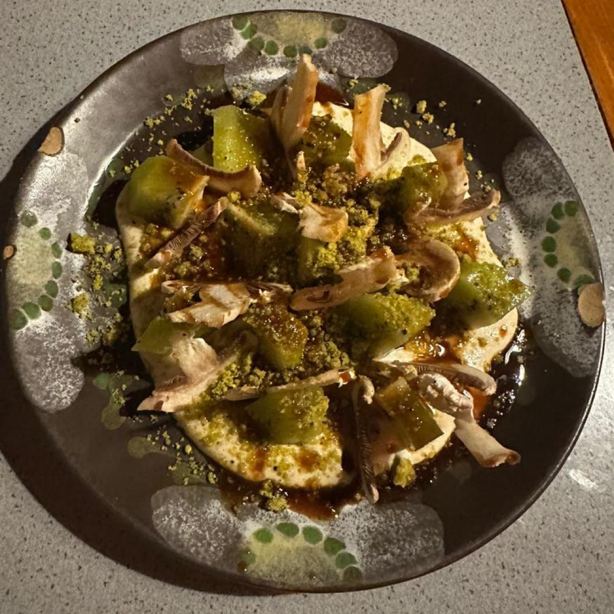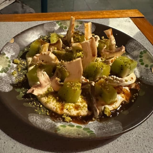 Hongos en un postre? En Donnet todo es posible! Originalmente es con frutillas pero no tenían así que salía con kiwi. Original, distinto, muy bueno!