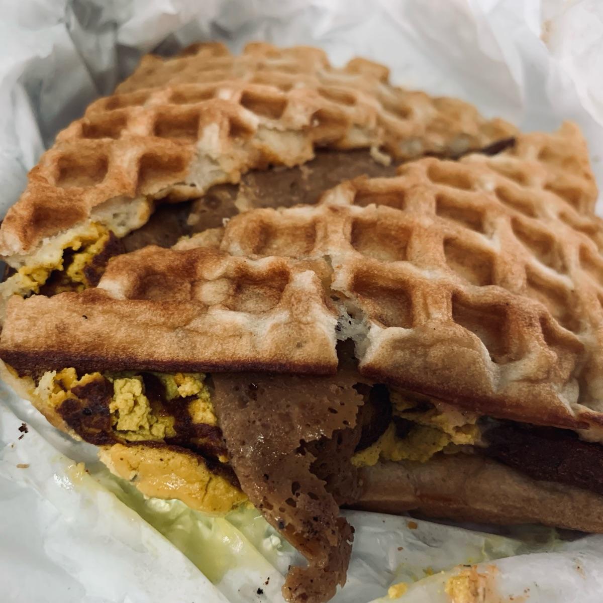 Brunch is at the next level! Tofu scramble, seitan and a thin “meat” all on a sweet #veganwaffle 🧇 Served with syrup and one side! Yum. #uplandspeak #seitan #maplesyrup #montecristo #indianapolis #brunch