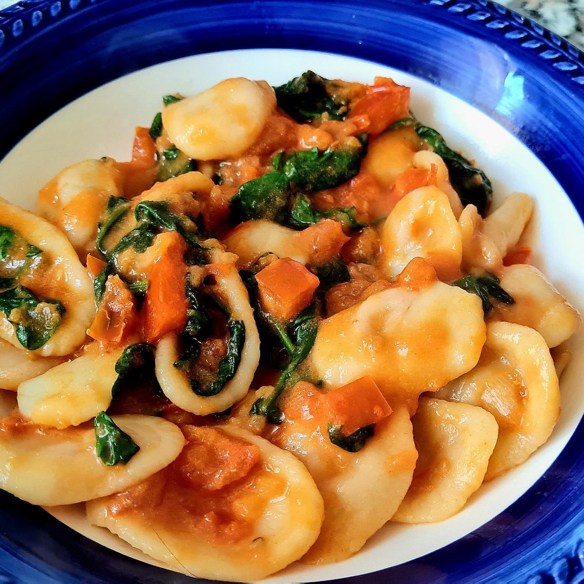 Oggi ho fatto delle semplici orecchiette di farina e acqua e le ho condite con sugo di pomodoro e spinaci.