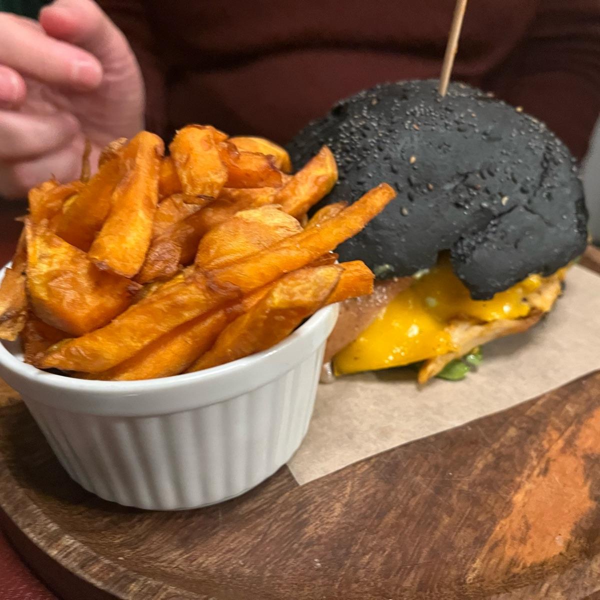 Hamburguesa de Heura, espinacas, guacamole, queso Cheddar y salsa de mostaza, con extra de bacon vegano y acompañada de boniatos. Muy rica, bonita y contundente, lo tiene todo.