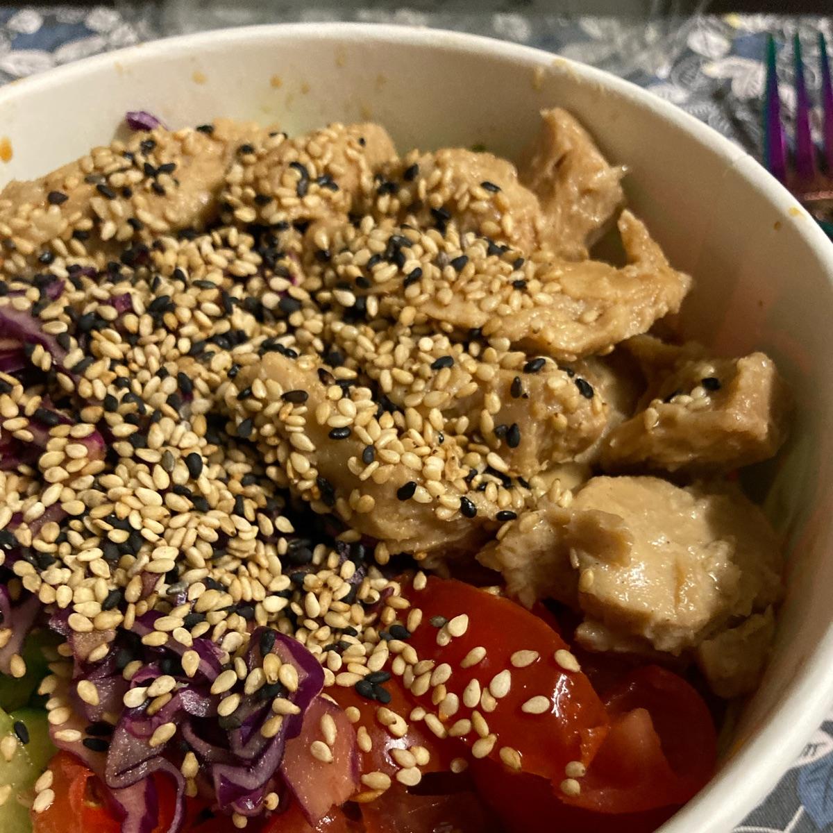 Molto buoni e similissimi al gusto del pollo, avrei voluto assaggiarli anche caldi ma comunque nella poke conditi così stavano lo stesso bene