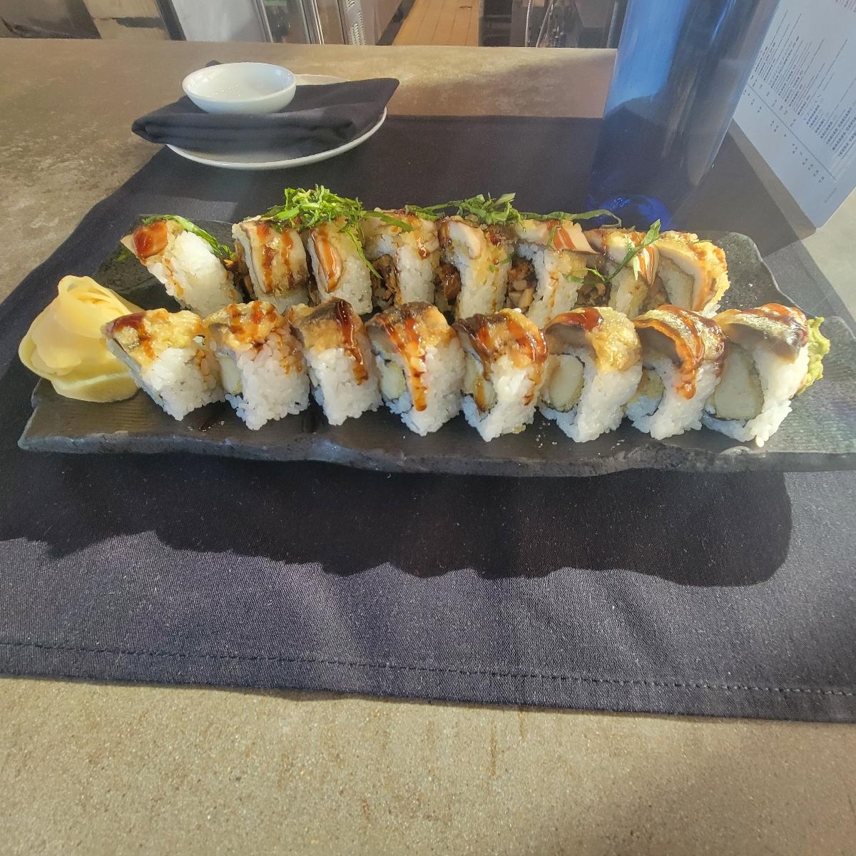 The roll thats being reviewed is the one on the top. Love thai basil. Mushroom had a great texture. Roll was a little too salty for my preference. Would have liked more of a noticable sweet potato flavor.