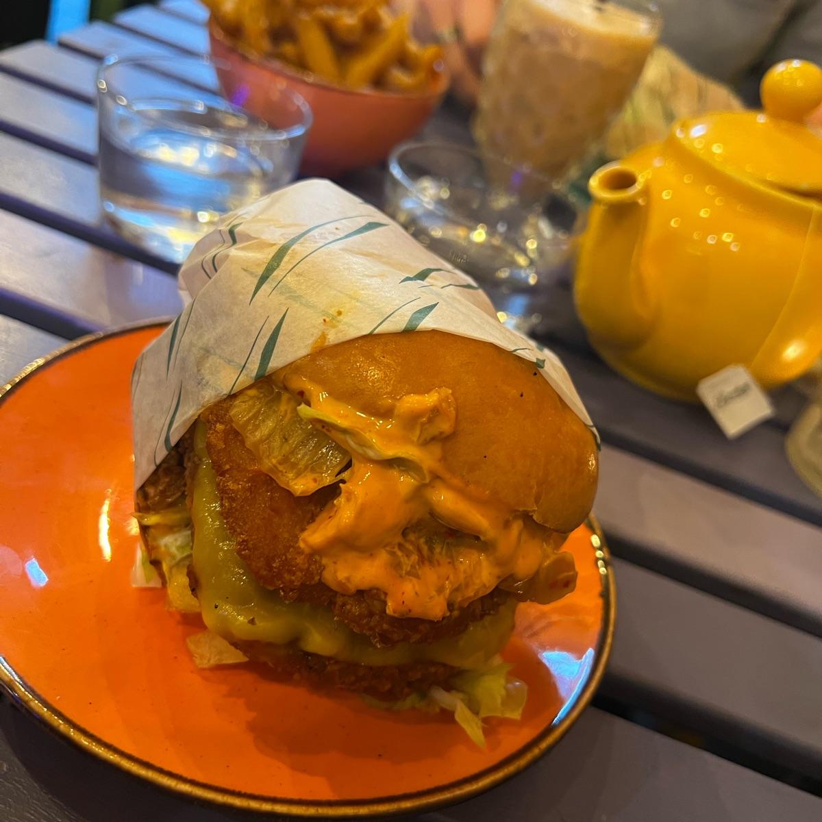 INCREDIBLE! Two chick’n patty’s, cheese, kimchi, salad all in a brioche bun. So good😍