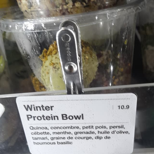 a picture so I came back to the fridge where they sell ready to eat meals, desserts, and drinks. This one had quinoa, zucchini seeds, pomegranate, mint, and a dallicious basil hummus dip that looked like