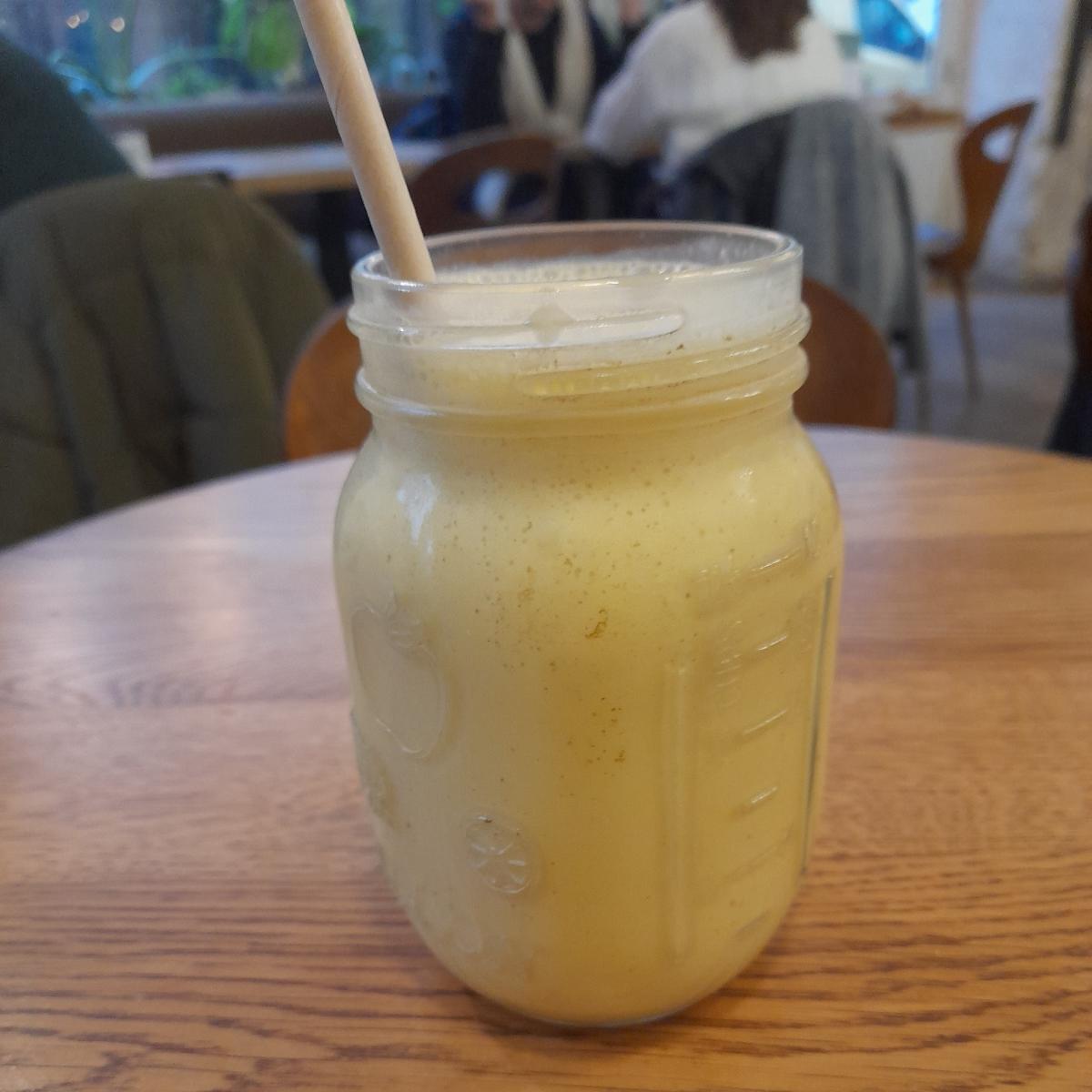 Great healthy smoothie. Good for the guts. It had almond milk, mango, and passion fruit.