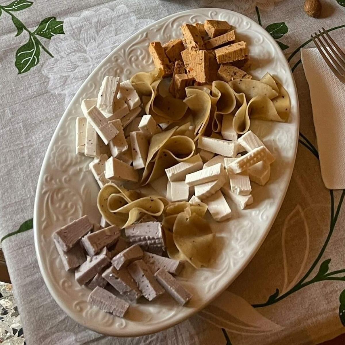 Piatto di antipasti composto da formaggi vegan e salumi vegan, ottimi i formaggetti