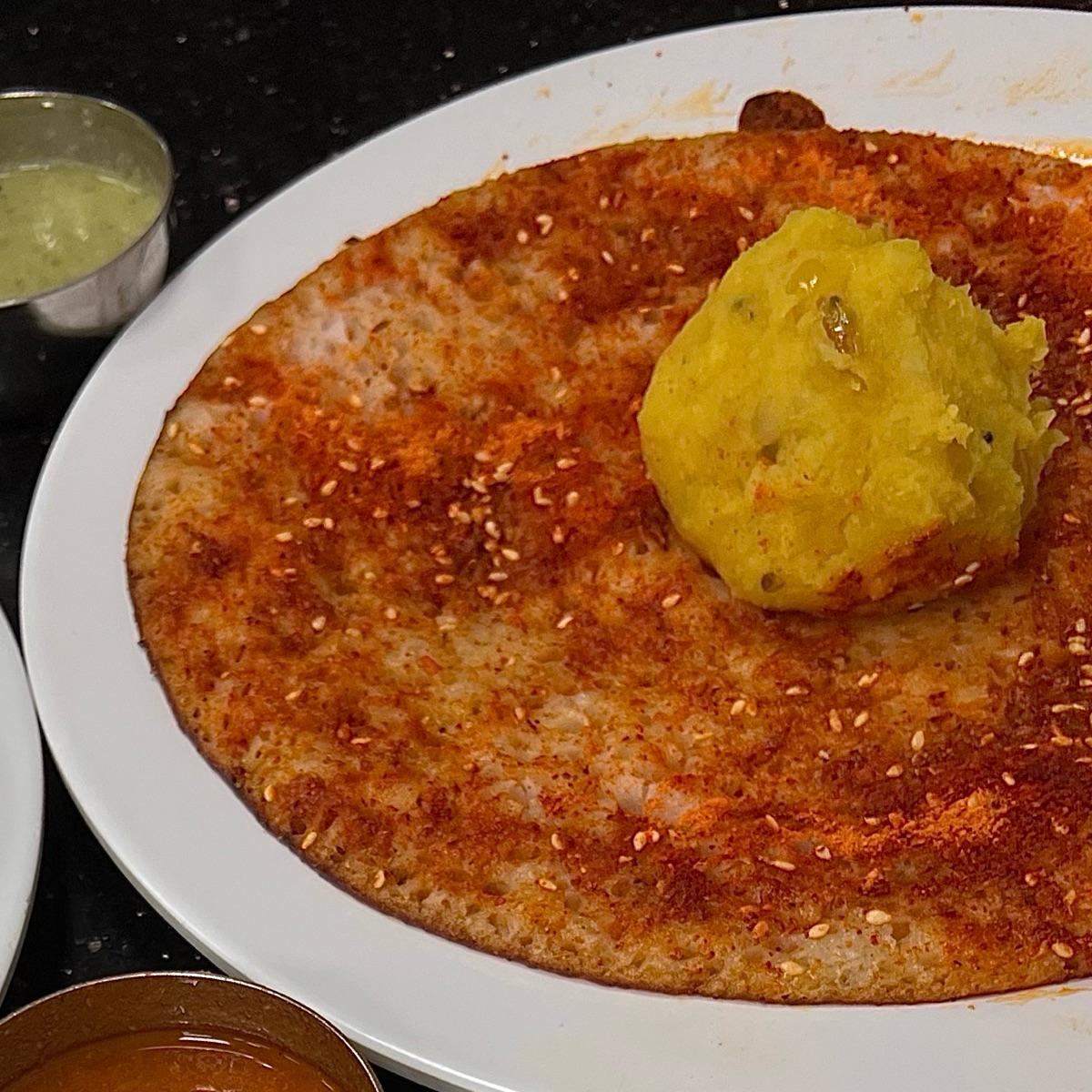 The dosa was prepared with an exemplary balance — crispy at the bottom and fluffy at the top!! Topped with chutney powder and spiced potatoes which were absolutely phenomenal.