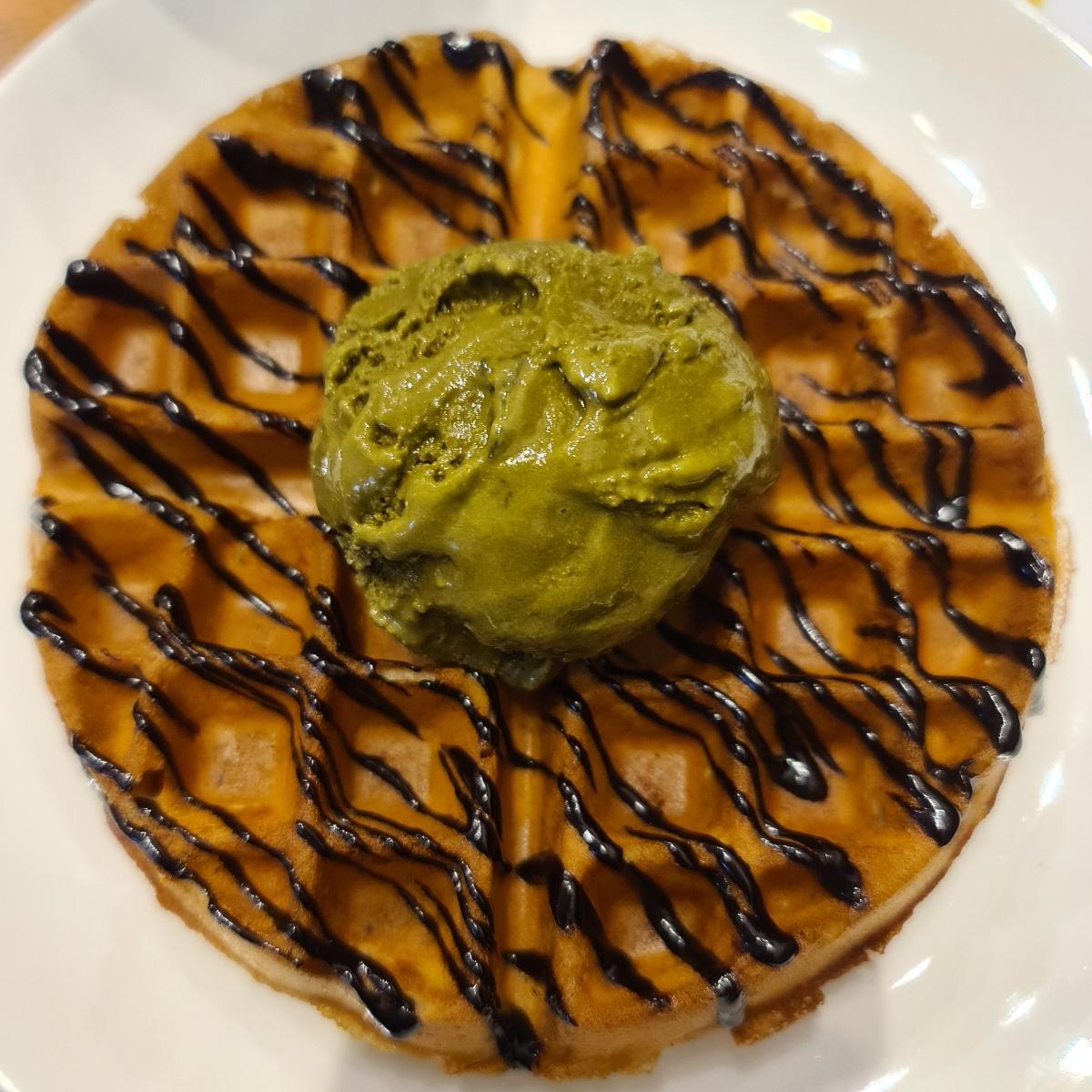 Got the waffle with Hojicha ice cream. Part 2 of self care time. Writing this as I am on the way home from the event that had no vegan food except oranges😝 Glad i decided to stop by mongchacha before heading over. I feel fat though... Anyway, the waffle is soft and fluffy. However, I like my #waffles crunchier so I might ask them to cook it a little longer next time. The #hojicha ice cream is #thicc but melted quickly :( overall though, the ice cream complimented the waffle well, thanks to the nice server who suggested. 10/10 would get again.