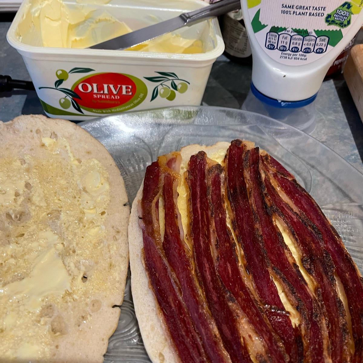 I love these focaccia. I chuck them in the freezer the day I buy them and then pop them in the toaster to defrost / warm. Always come out perfectly. Served here with this is bacon but I also love them with hummus and veggies.