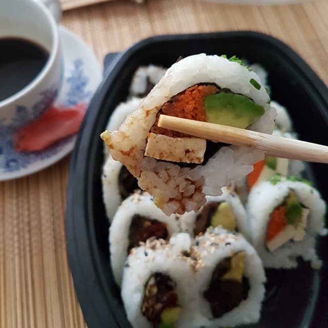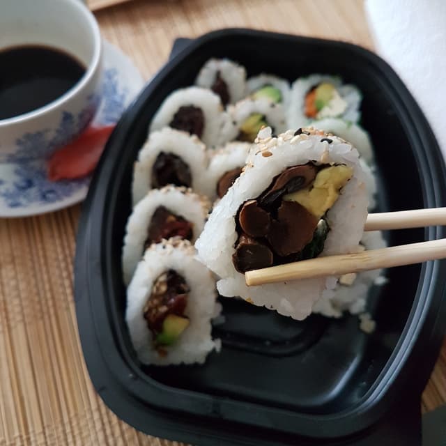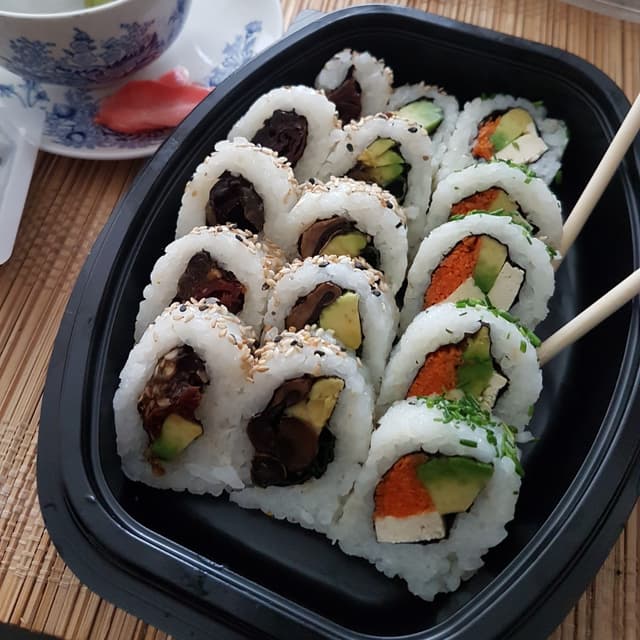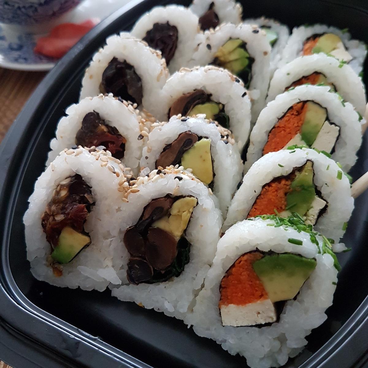 Riquisimo esta tabla vegan de 15 piezas de 3 sabores diferentes, palta tofu y zanahoria, hongos y palta, tomates disecados con palta. Delicia . Precio 1670.