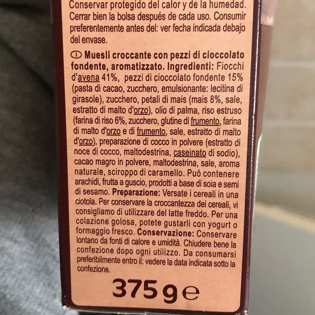 Muesli croccante al cioccolato fondente. Buono, ma ricordarsi che risulta abbastanza dolce