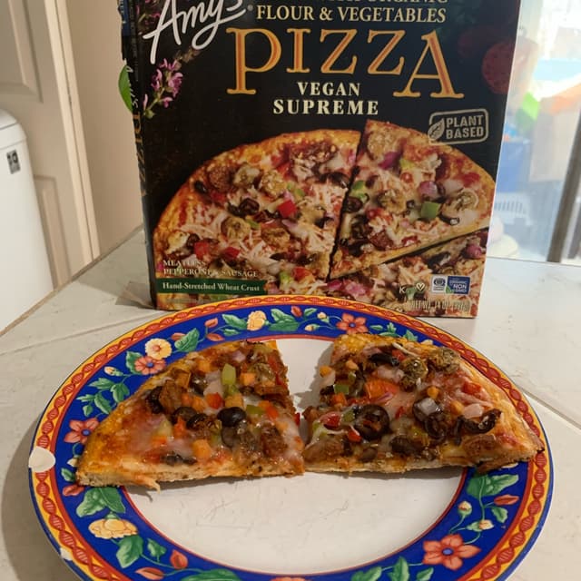 This is a pretty good frozen vegan pizza. The cheese is okay, has a daiya flavor to it. I love all the peppers and onions though. It’s a good go to if you need a quick meal.