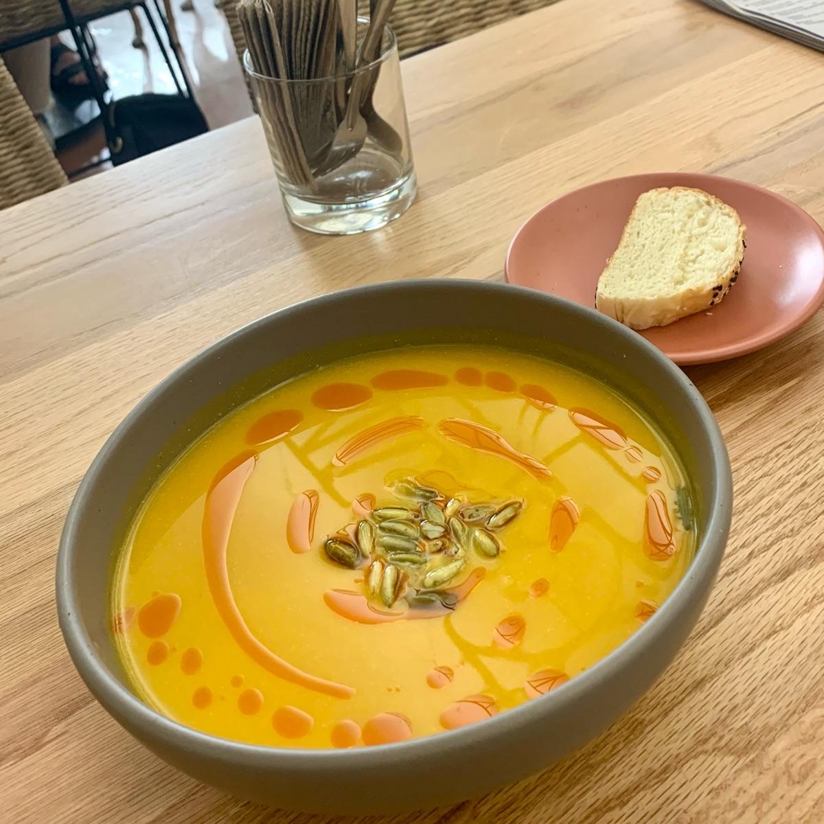 En este restaurante van cambiando las opciones de sopas, esta vez probé esta rica sopa de calabaza con zanahoria, les quedó muy rica, la consistencia espesita y el decorado le dio un rico sabor con las semillas de calabaza y un poco del caldito de la salsa macha para ese toque picosito. La porción podría ser para compartir porque es grande. Sí la recomiendo #veganfood #vegansoup #abillionlove #mexicovegano