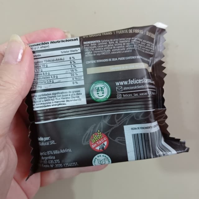 Al principio me pareció cartón, típico sabor a galleta de arroz, después sentí que el dulce está bastante bien impregnado en las galletas y se me hizo bastante rico. Para la oferta que tenian de 2x1 me pareció una buena opción. También para personas que necesitan un producto sin TACC. Si fuera uno solo me parece un poco caro y por el mismo precio prefiero el de chocolate negro.