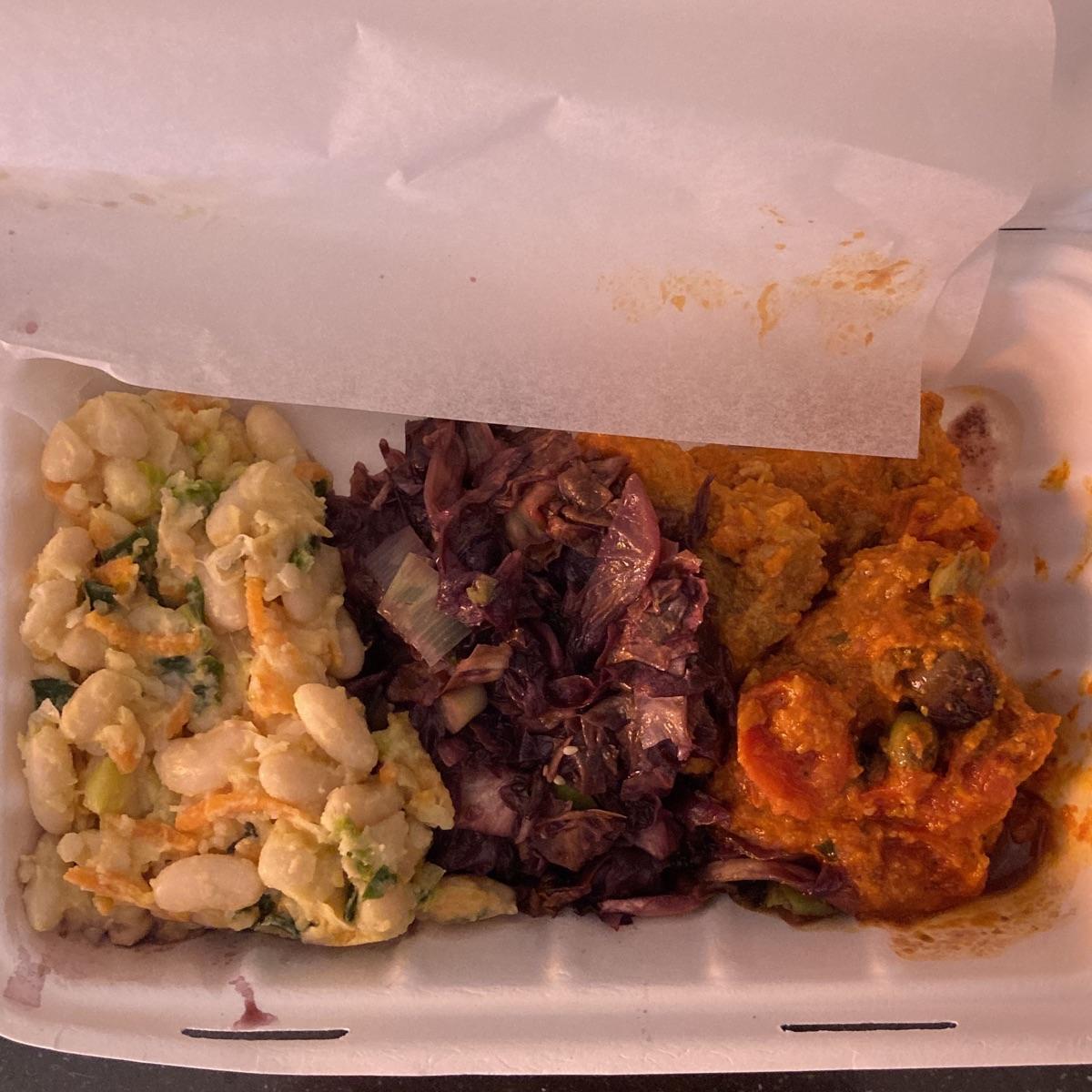 Fagioli cannellini alla senape, spadellata di radicchio e mele, bistecchine di soia alla pizzaiola. Tutto biologico