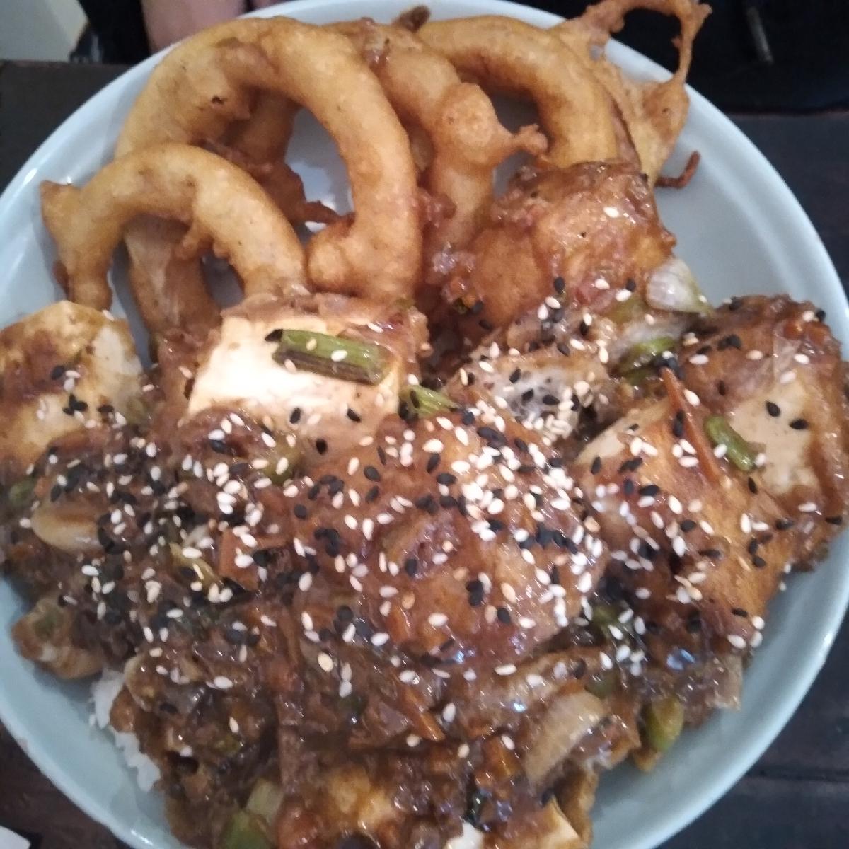 Fui a comer con mi hije a Barranco y queríamos algo de comida asiática. Compartimos un donburi miso servido genersoamente y con aros de cebolla. Elle se sorprendió de la cantidad que sirven por 25 soles.