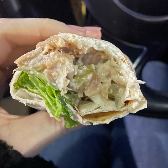 Oh my god I LOVED this wrap. Chicken Caesar Wrap used to be my go to when I ate meat, so to have one so close to the original made me very happy. The “chicken” had a creamy chunky chewy texture, very close to real chicken. The dressing was super salty like the real deal with the added crunchy bonus of gherkins! Loved it.