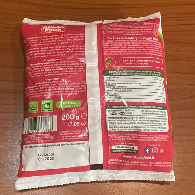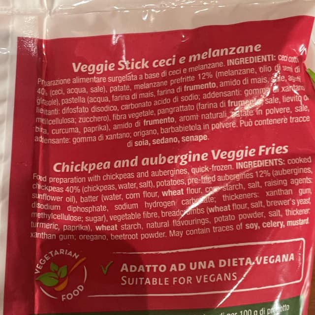 Bastoncini surgelati pronti di ceci e melanzane (che, a mio avviso, non si sentono per nulla) da buttare in olio caldo per un’esplosione di gioie e frittura o da sistemare su una teglia in forno mentre cuoce altra roba.
