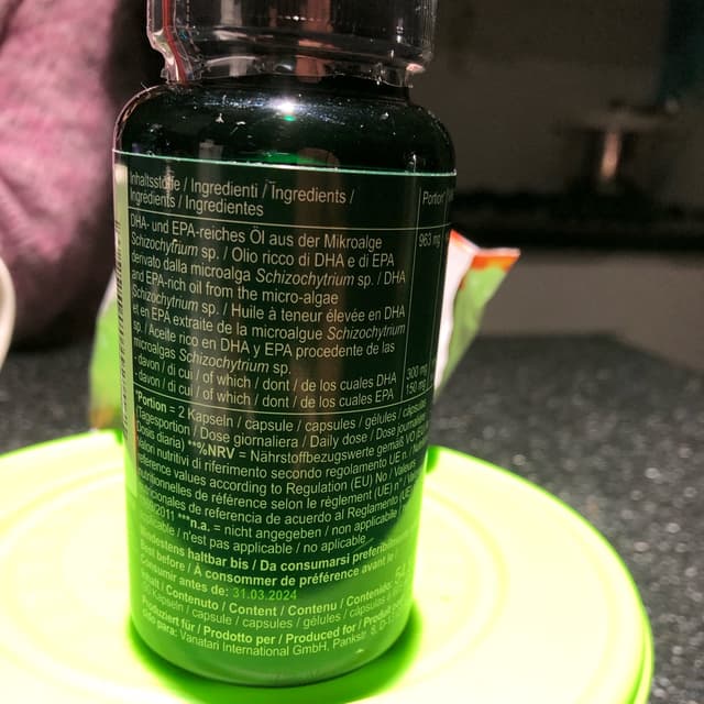 Integratore di omega-3 a base di olio di alghe di Vegavero: importantissimo integrarlo all’interno di una dieta Vegana 🌱, difficile trovarne uno la cui capsula solubile non abbia ingredienti di origine animale ed abbia i giusti valori. Questo lo ha consigliato l’omeopata di mia mamma proprio per la composizione. Ha tutti i valori giusti, 2 capsule al giorno (sono un po’ grandine) con i pasti, l’unico difetto è che si ripropone un po’. #omega3 #alghe