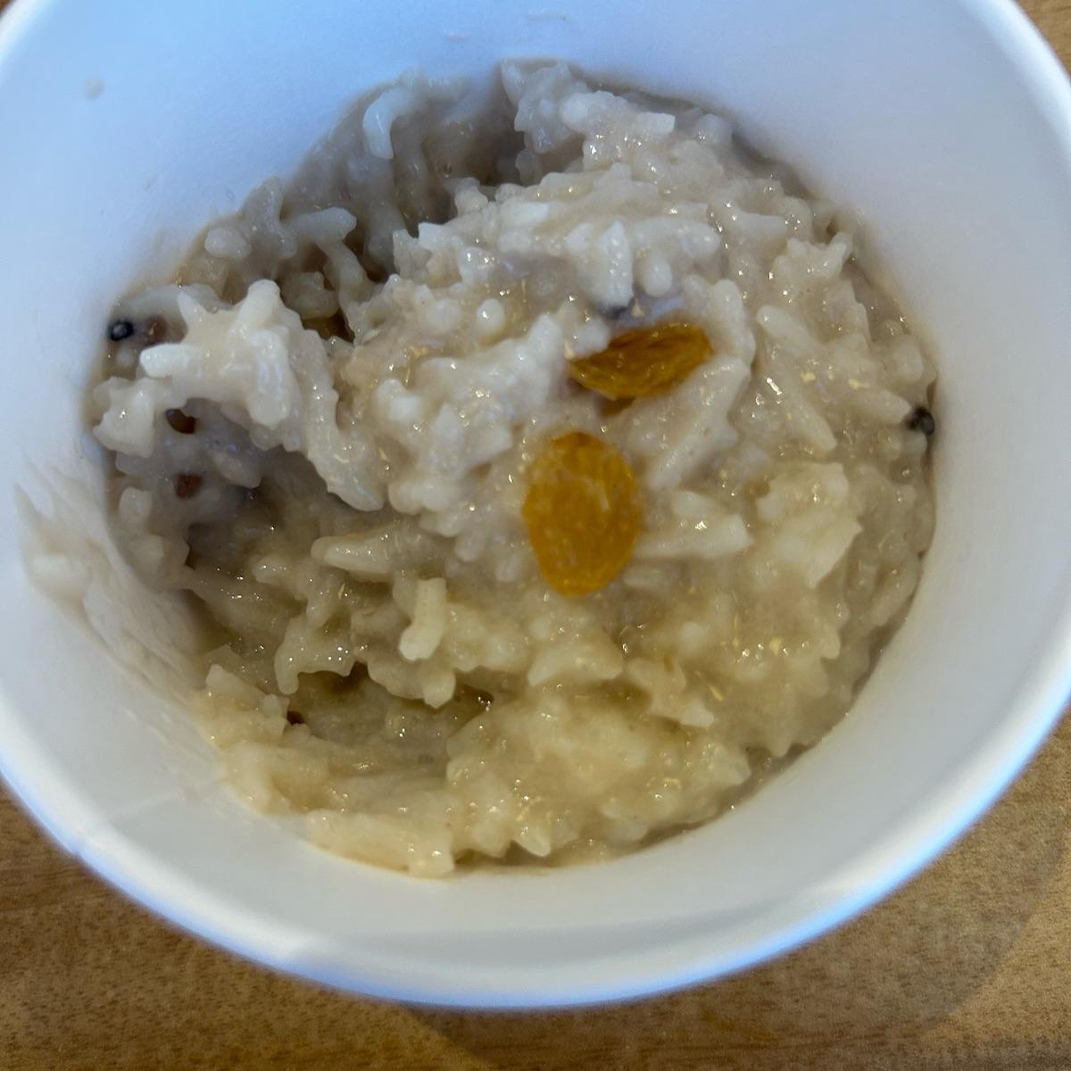 This is rice pudding made with rice, coconut milk, raisins, and cinnamon. It’s pretty tasty. It reminds me of horchata a lot