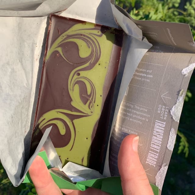Gorgeous! I really love this bar. The matcha here shines, blended into a sweet white chocolate swirl. The dark chocolate base and the sweet matcha go so well together. Definitely recommend this one!