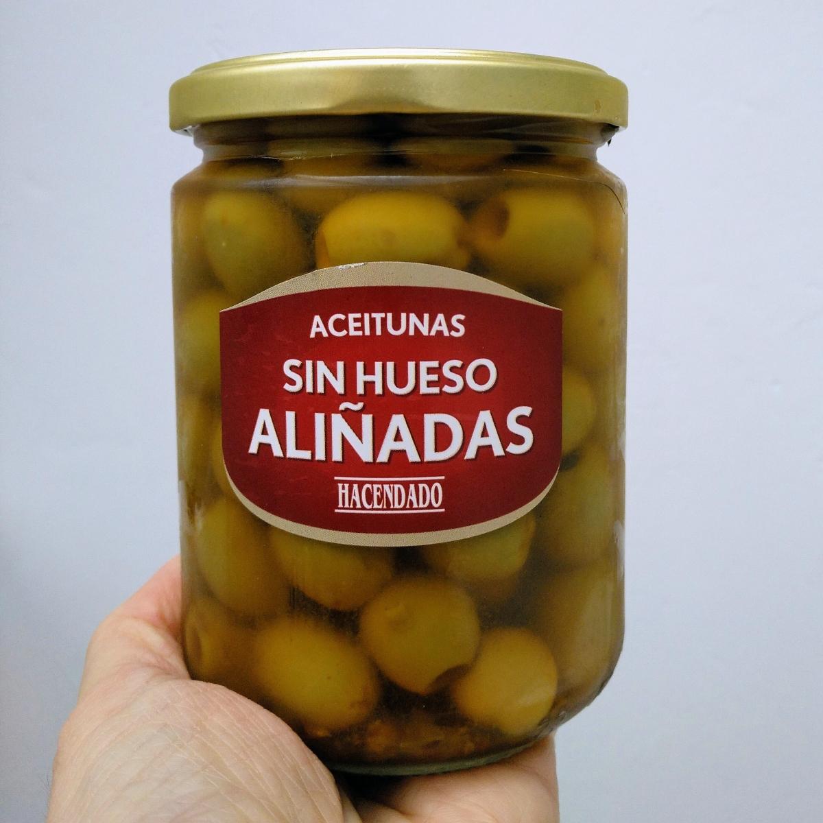 Aceitunas verdes sin hueso aliñadas de la variedad manzanilla fina. En su aliño lleva pimiento, ajo, sal, vinagre, pimentón, especias y otros tantos ingredientes químicos como potenciadores de sabor, antioxidantes, conservantes, etc.