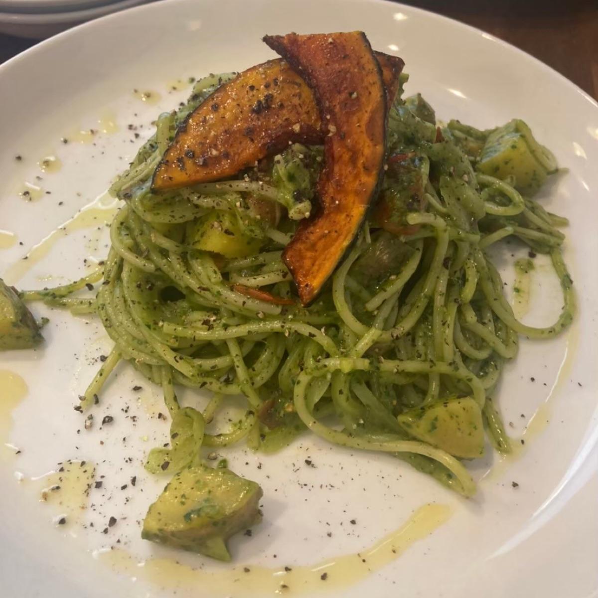 Had inventive dishes for lunch at a fully vegan Italian restaurant. Creamy basil pesto pasta and smoky and cheesy sauce pizza with fresh veggies toppings were so tasty.
