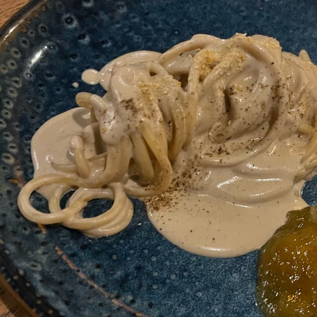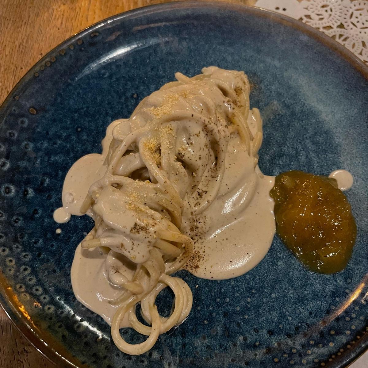 Spaghettone con crema di noci di macadamia super gustoso e sostanzioso con pepe e polvere di bergamotto. Ottimo primo piatto da non perdere 😊 #spaghettodigragnano #romeowcatbistrot #vegan #veganroma