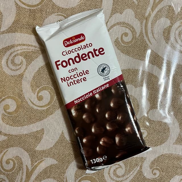 Quando compro il cioccolato fondente preferisco di solito percentuali di cacao più alte, ma in questo caso l’aggiunta di nocciole italiane intere lo rende delizioso in ogni caso!
