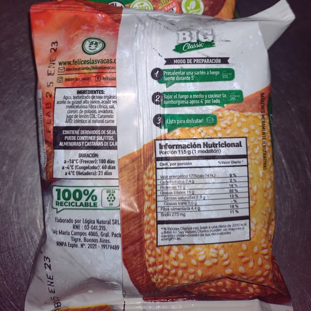 Hamburguesa de soja, sin tacc, apto kosher. Huele distinto durante su cocción en comparación al resto, de sabor no me gustó pero en sandwich safa. Sabor ahumado. Vienen dos medallones y son mas grandes en comparación a otras marcas 🍔