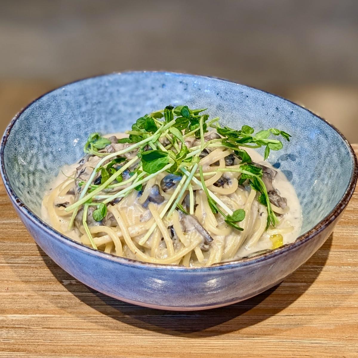 Topped with portobello and button mushrooms as well as pea spouts, with a choice of spaghetti or gluten-free penne. The creamy cashew sauce contained thyme and rosemary, but I found it kind of bland and boring (I've eaten allium-free whole-food plant-based cream pastas that were much more flavourful and affordable than this). Would have liked more herbs, and maybe miso and nutritional yeast infused into the sauce, or perhaps a few roasted nuts or sun-dried tomatoes sprinkled on top for better taste and texture! Sadly the least favourite main I've ever had here. To be fair my partner enjoyed this and I only tried eating it when it had started getting cold, so maybe it would have been better when just freshly served! (Contains alliums, $18) #sgvegan #wholefoodplantbased #wfpb
