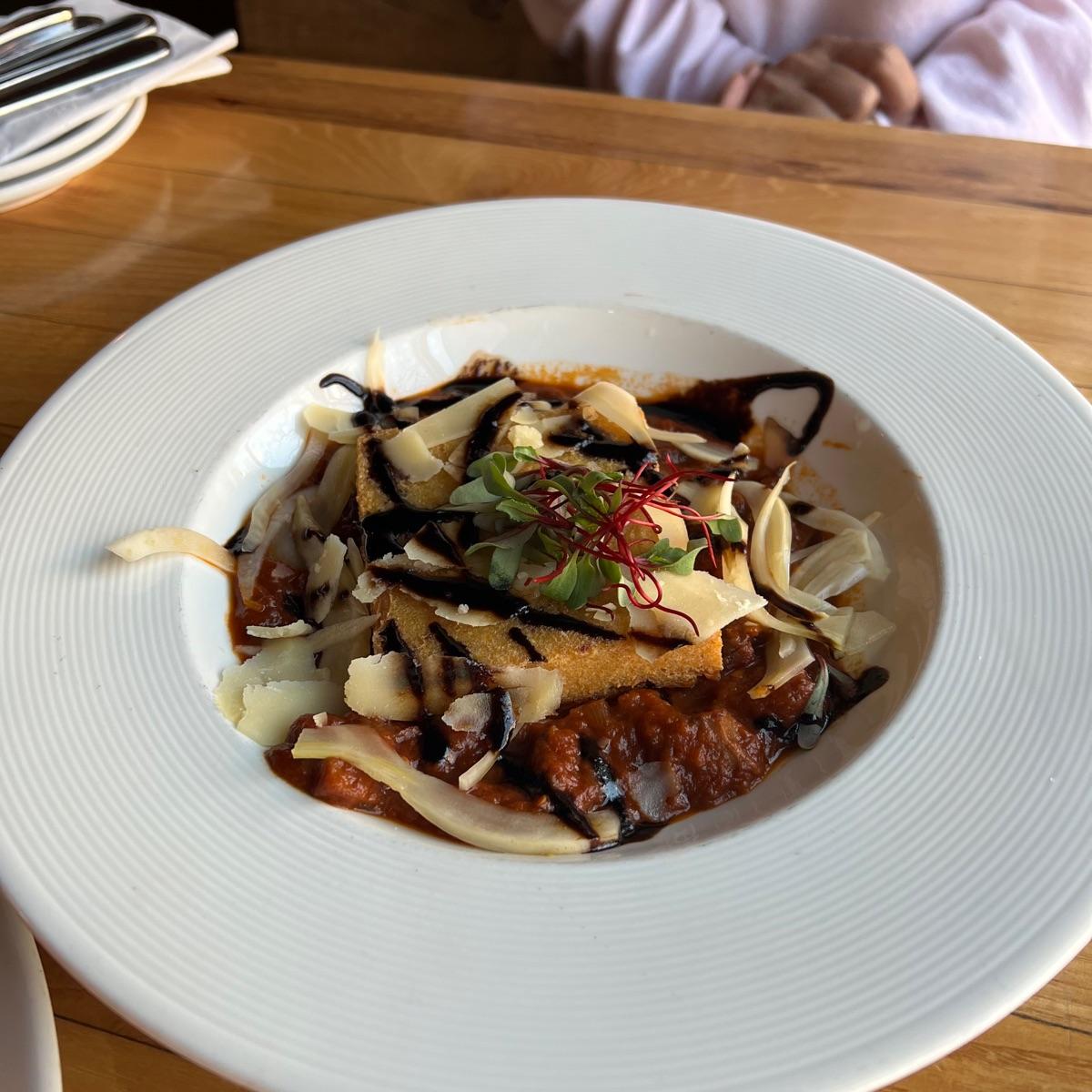 pasta was accompanied by a mushroom and eggplant red sauce and artichokes. i enjoyed the fried polenta and balsamic glaze. the dish felt very elegant, and the flavors blended together perfectly; it was clearly well thought out. the dish is also light, but still filling.