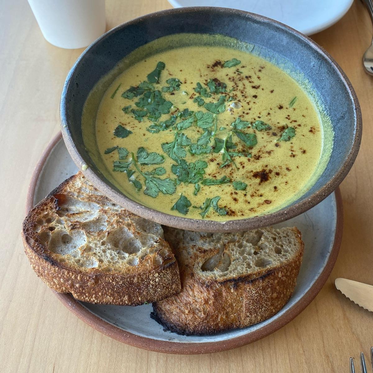 Outstanding soup with a rich robust flavor, nice texture, not thickened with fillers, but thick with smooth flavorful ingredients and served with delicious bread. This was one of the best soups I’ve ever had!