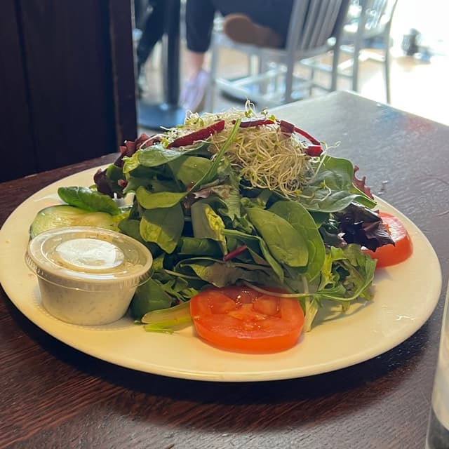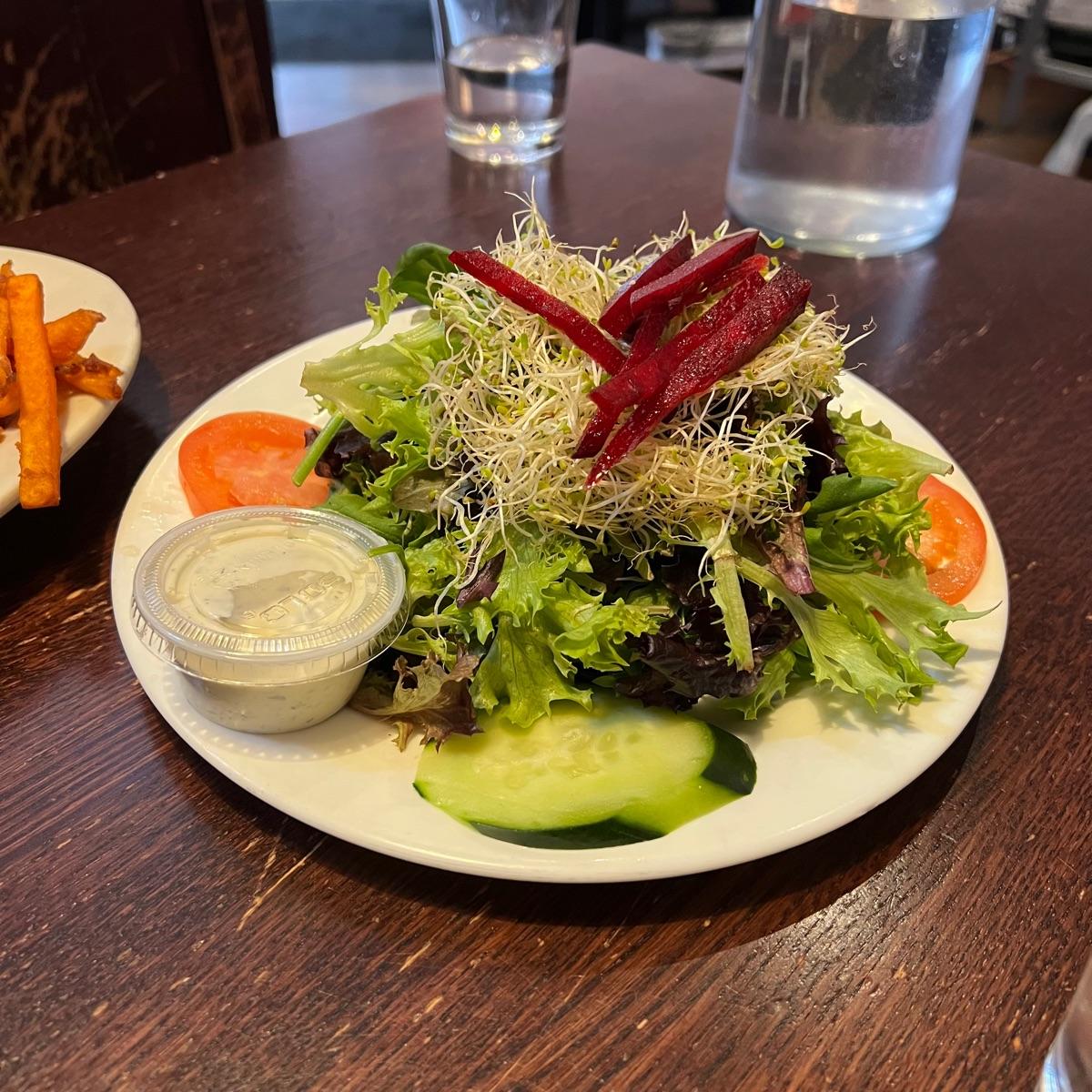 a nice side salad served with ranch! i enjoy the mix of greens and vegetables they use, and it’s always a solid salad