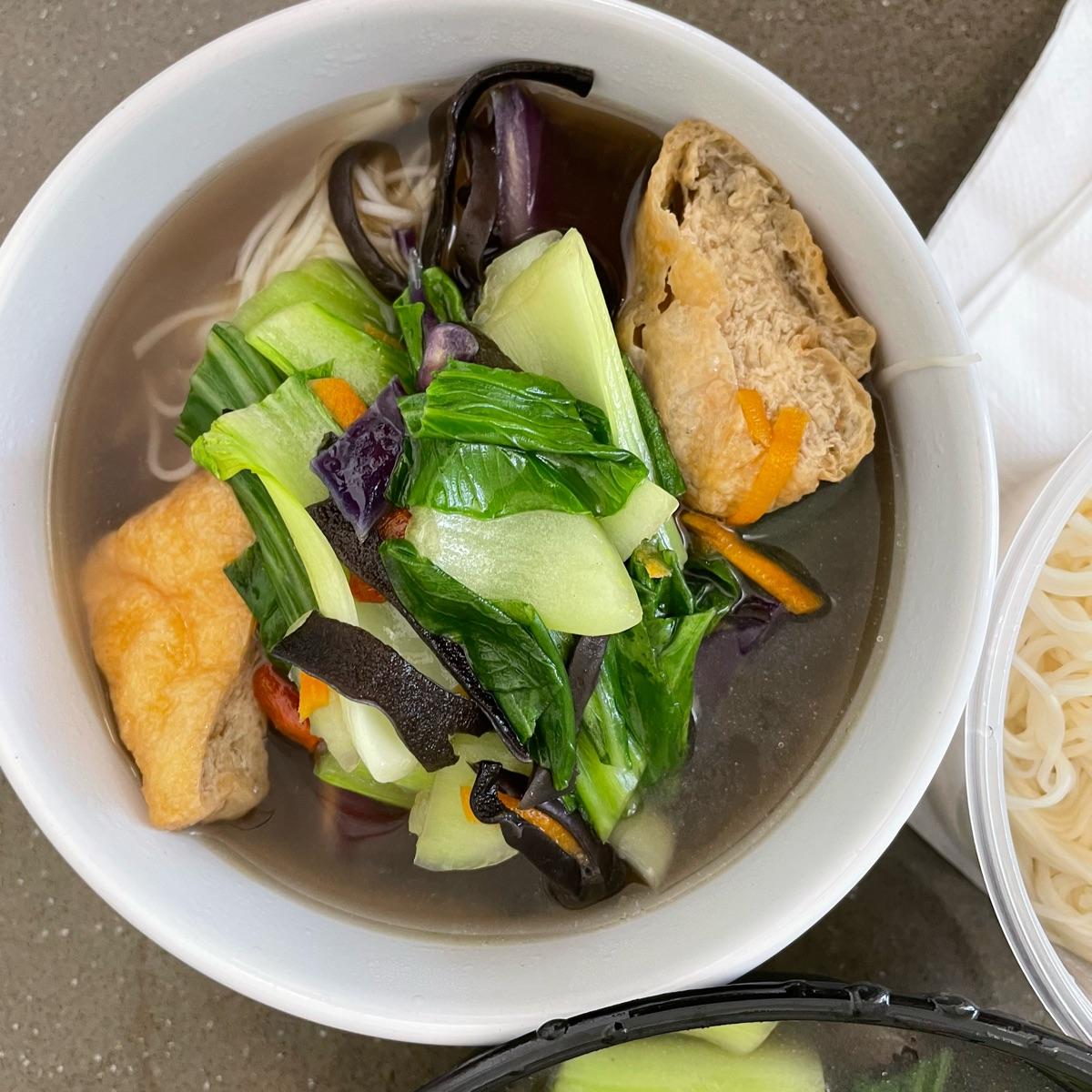 This is described on the menu as “thin noodle soup with shiitake mushroom, soy protein, goji (lycium), seasonal veggies and sesame oil”.