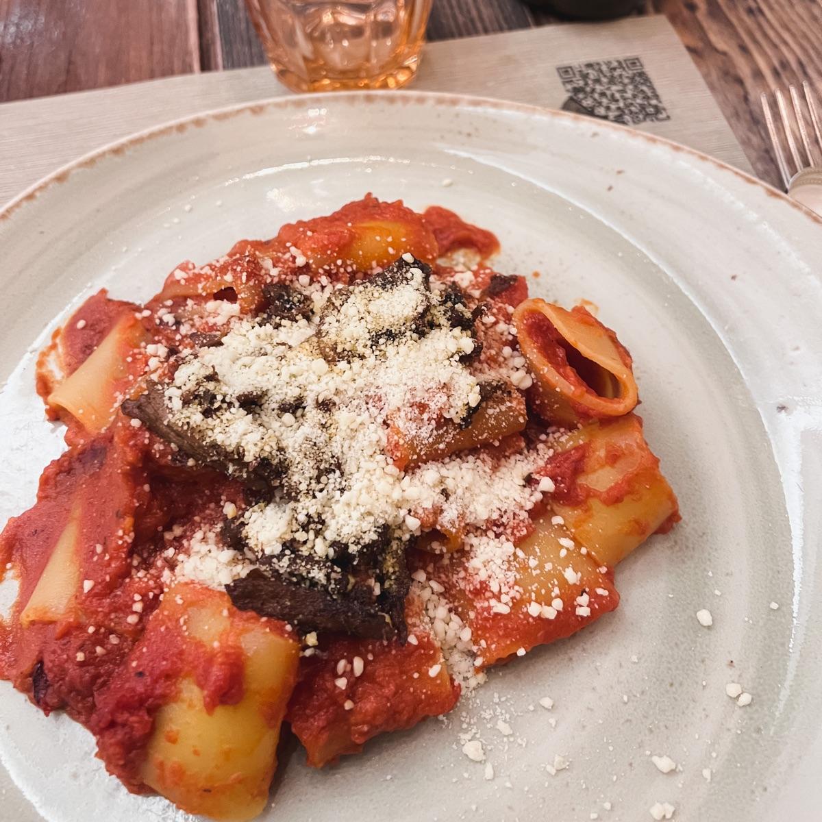 The queen of the menu: the tomato sauce is laced with the chef’s secret homemade cheese, topped with vegan speck. This was half portion by the way 🍝